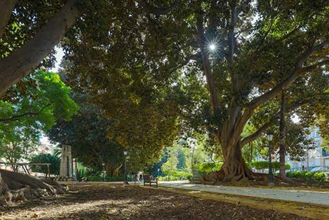 Este jardín, situado en la Glorieta de España, frente a la Casa Consistorial, es uno de los espacios urbanos más bullicioso y destacado de Murcia.