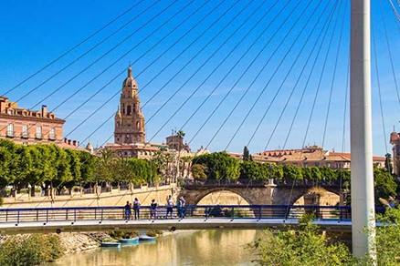 El margen derecho: la Pasarela Manterola. Si miras por el margen derecho del puente podrás ver "La Pasarela Manterola", un puente peatonal obra de Javier Manterola, que comunica la zona del Malecón y el barrio del Carmen con el Mercado de Verónicas y el Palacio de Almudí. Su diseño asemeja un barco que atraviesa el río, con un mástil de 30 metros de alto al que van unidos 45 tirantes de acero, de los que treinta sostienen la base y quince actúan de contrapeso entre la estructura y el islote artificial, formado en el lecho del río. La pasarela de Manterola, cambió la imagen de los puentes sobre el río Segura a su paso por Murcia, aportando un toque de modernidad a la imagen tradicional de la ciudad. Fue inaugurada el 12 de agosto de 1997.